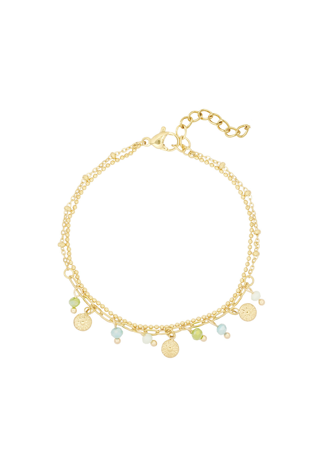 Muntjes en kralen armband in het blauw/goud.